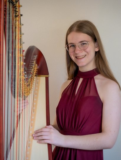 My name is Megan van Uffelen, I was born in Zwolle in 2005. At the age of six I fell in love with the harp. When I was seven years old I started playing lever harp. I made the switch to the pedal harp at age twelve and started taking lessons with Manja Smits. In 2019 I was accepted into the Young Talentclass of the ArtEZ conservatory in Zwolle. In September 2022 I was accepted to move on to the Classical Music Preparatory course of the ArtEZ conservatory. From September 2023 I started the Bachelor Classical Music - Major Subject Harp at the ArtEZ Conservatory, where I continue my lessons with Manja Smits.